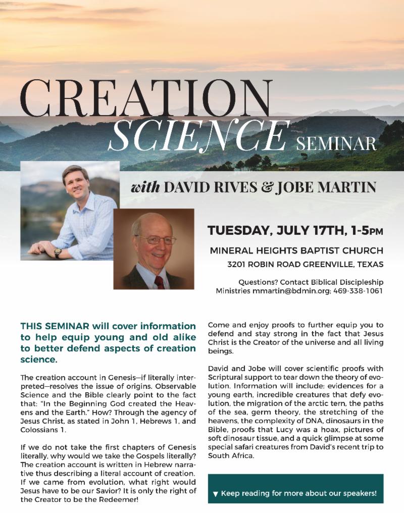 Just wanted to give you a quick reminder that I will be presenting with Dr. Jobe Martin this coming Tuesday, July 17th at Mineral Heights Baptist Church in Greenville, Texas. The first session will begin at 1:00PM and we will end at 5:00 P.M. There will be time for questions and answers and light refreshments will be served during the breaks. We will have material available and want to invite all of you in and around the Dallas area to come out for the free seminar.